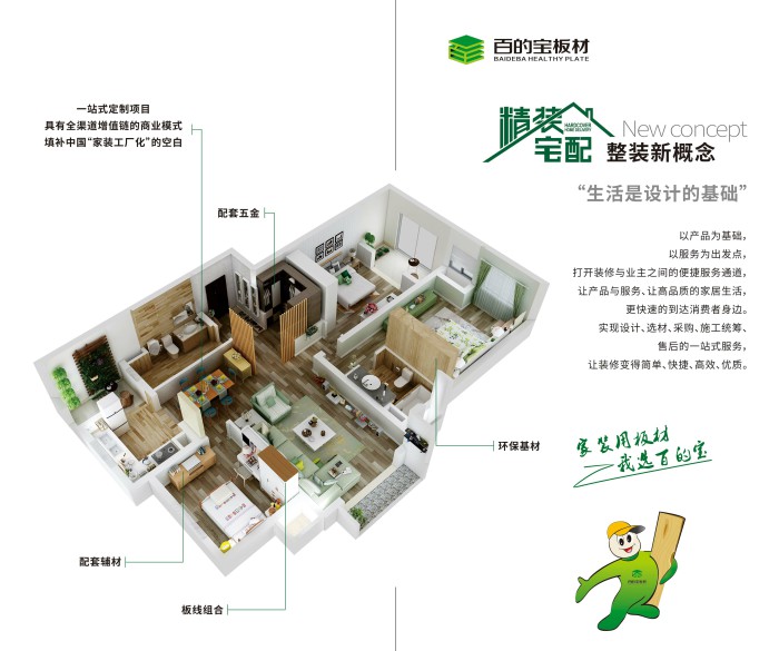 百的寶健康板材?精裝宅配是基于快速設計+標準板件+前端裁切安裝的家裝新模式,極簡操作流程大幅度縮短了裝修工期,解決了業主設計難、選材累、過程苦、效果差等煩惱。