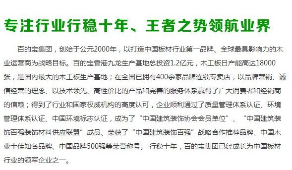 家居行業的文化更多的是要倡導無污染,倡導綠色健康家居生活理念,讓更多的百姓遠離污染,遠離裝修污染,遠離空氣污染,真正享受健康,享受環境,而對百的寶來說,提供高品質環保產品本身就是企業的基本責任和義務。