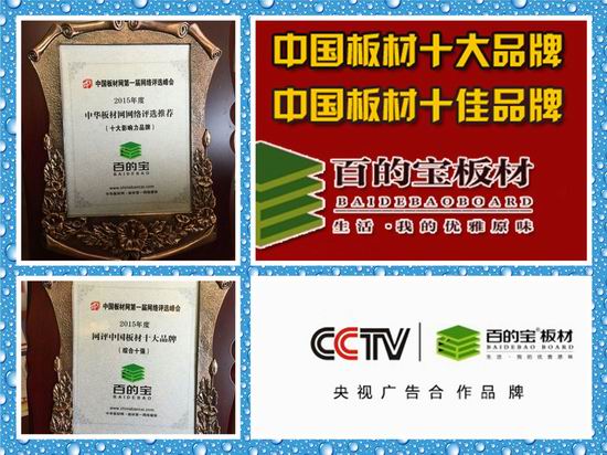 目前,百的寶已經(jīng)憑借良好的品牌形象和口碑享譽(yù)全國,推行的環(huán)保理念更是得到消費(fèi)者一致的好評,連續(xù)兩屆蟬聯(lián)“中國板材品牌”實屬實至名歸!