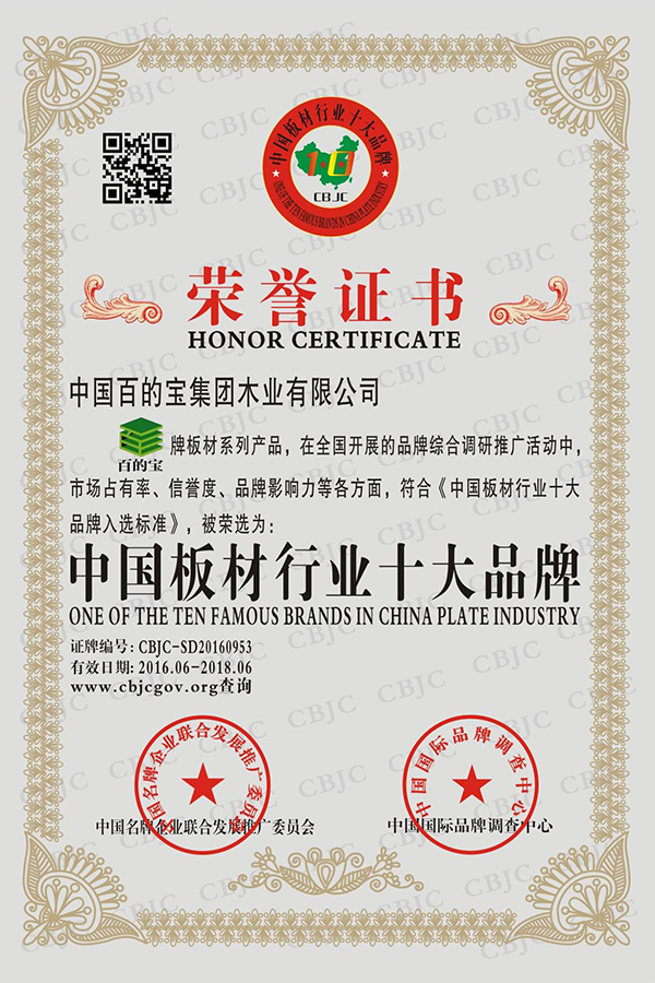 2016年06月中國名牌企業聯合發展推廣委員會、中國國際品牌調查中心檢測,授予中國百的寶集團木業有限公司旗下“百的寶”品牌“中國板材行業品牌”榮譽稱號。