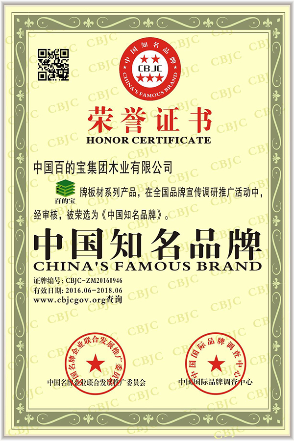 2016年06月中國百的寶集團木業有限公司旗下“百的寶”牌板材系列產品被中國名牌企業聯合發展推廣委員會、中國國際品牌調查中心檢測,選為“中國知名品牌”。