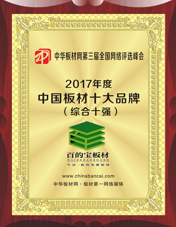 在品質(zhì)上嚴(yán)格要求、在品牌形象上嚴(yán)格管理,兩手抓兩手硬的優(yōu)良作風(fēng)讓百的寶板材獲得了不俗的市場(chǎng)口碑,并連續(xù)多年獲得“中國(guó)板材品牌‘榮譽(yù)。